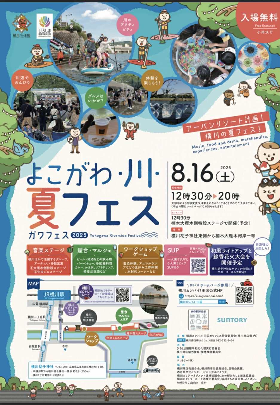 ◆協力:横川商店街連合会、横川商店街振興組合、三篠公民館、西区民文化センター、ひろしまSUPクラブ、横川エリアマネジメント連絡協議会、水の都ひろしま推進協議会、横川ビクトリーロード活性化委員会、横川まちの芸術祭-よこげい-、AAIひろしまplan …ほか